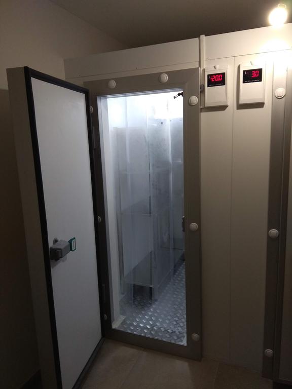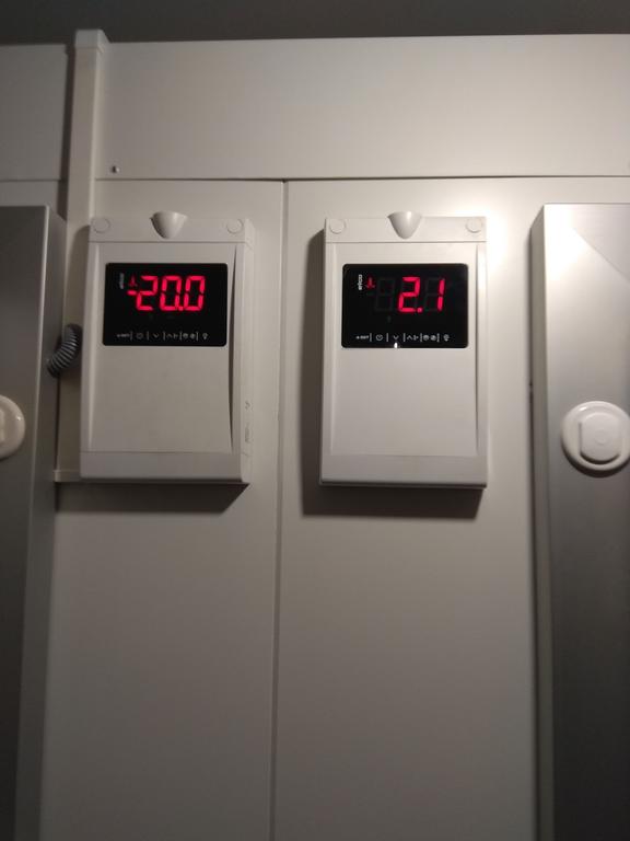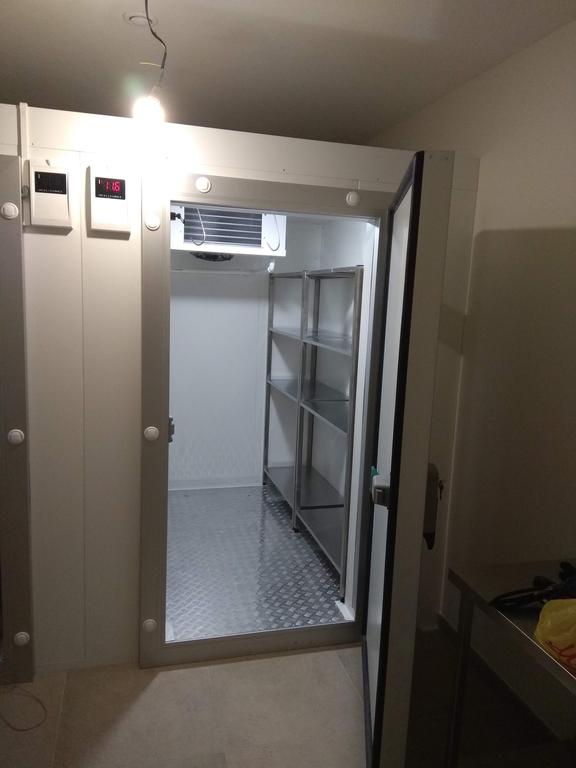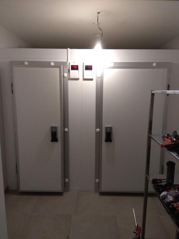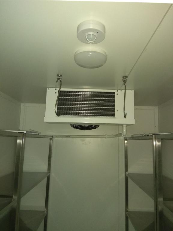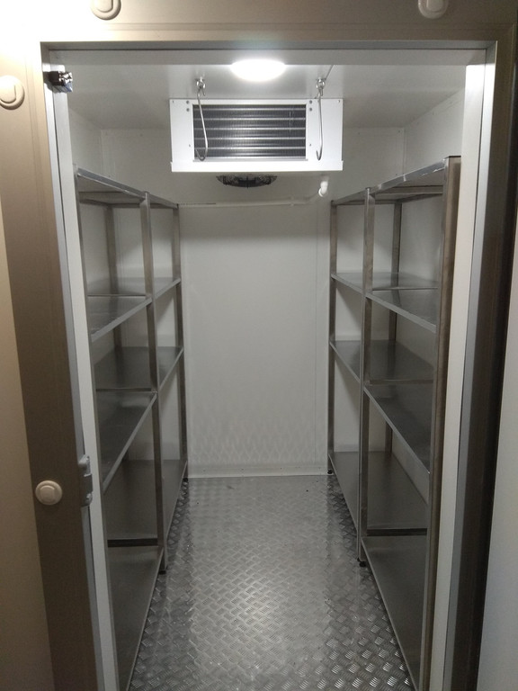 Камеры выполнены из сендвич-панелей толщиной 100мм, холодильные двери категория "ЛЮКС" , малошумные холодильные агрегаты, установлены датчики освещения, концевые выключатели на отключиние вентилятров при открывании двери, автоматика европейских производителей, нержавеющие стеллажи.